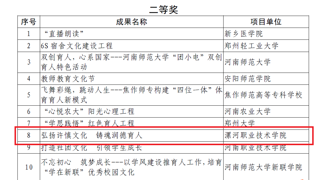 近日,河南省委教育工委河南省教育厅公布第三届普通高等学校校园文化建设优秀成果获奖名单,我校申报的《弘扬许慎文化铸魂润德育人》荣获二等奖。