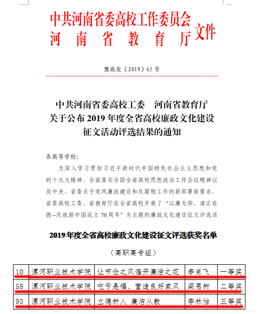 近日,中共河南省委高校工委、河南省教育厅下发《关于公布2019年度全省高校廉政文化建设征文活动评选结果的通知》(豫高发〔2019〕65号)文件,对2019年度在全省高校廉政文化建设征文评选活动中的获奖者予以表彰。我校工商管理系李肖飞撰写的《让节俭之风催开廉洁之花》荣获一等奖,监察审计处梁恩树撰写的《吃亏是福、营造良好家风》荣获二等奖、人事处李林怡撰写的《立德树人 廉洁从教》荣获三等奖。