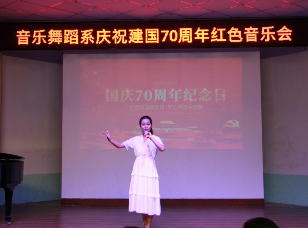 在新中国成立70周年之际,音乐舞蹈系党总支组织音乐专业师生举行庆祝建国70周年红色音乐会。音乐会上,广大师生演唱了10余首催人奋进、经典永恒的红色歌曲,“传承红色基因,牢记初心使命”。《我的祖国》《游击队歌》《我爱你中国》《我爱五指山、我爱万泉河》《长江之歌》《军港之夜》《保卫黄河》等歌曲依次登场,大家热血沸腾,不由自主随声歌唱,用歌声祝福伟大的祖国繁荣昌盛。