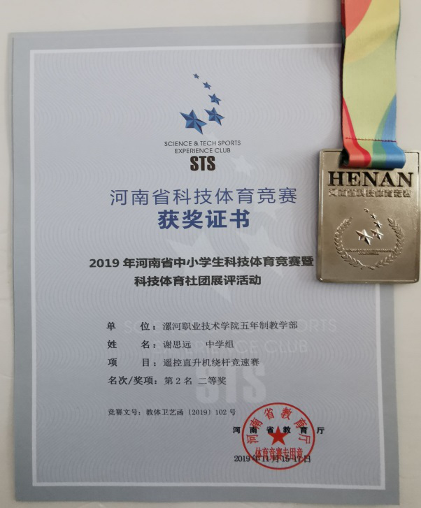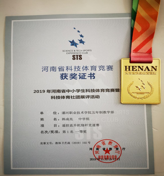 11月16-17日,由河南省教育厅主办,河南省学生体育总会科技体育协会承办的2019年河南省科技体育竞赛暨科技体育社团展评活动在郑州举行。我校五年制教学部学生韩成亮、谢思远在卢荣华、高倩老师的精心辅导下,从89支参赛队的1900余名队员中脱颖而出,在“遥控直升机绕杆竞速赛”项目中喜获第一名、第二名的好成绩。