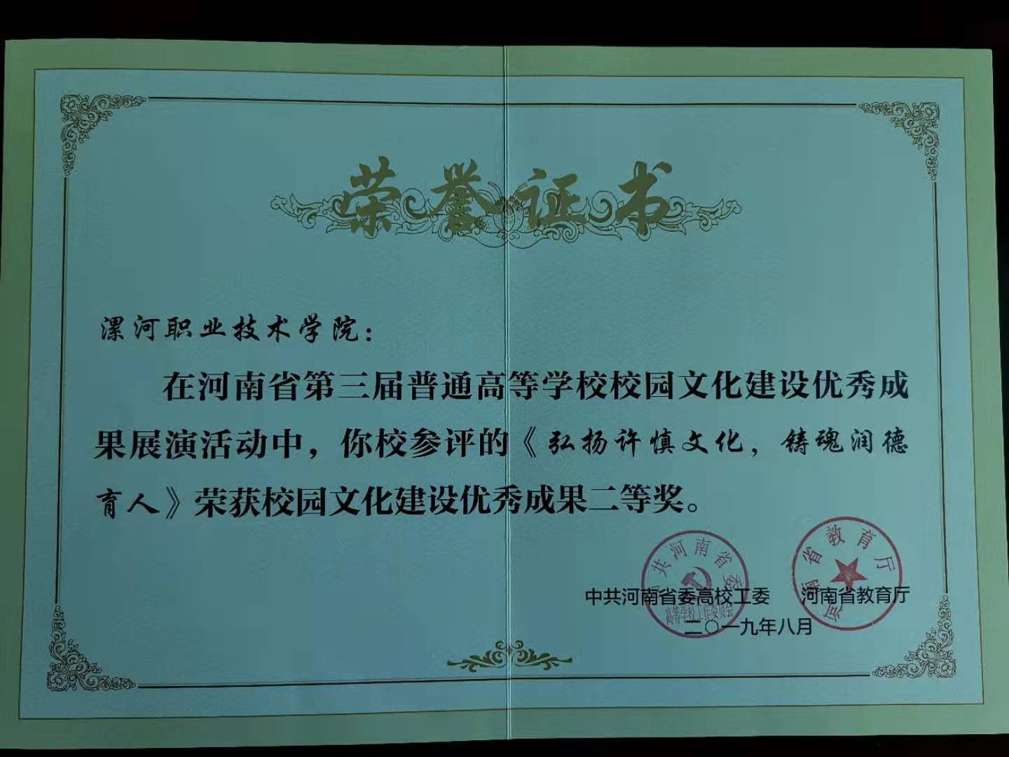 我校申报的《弘扬许慎文化,铸魂润德育人》荣获本届“大美学工”活动二等奖,是我校在河南省普通高校校园文化建设“大美学工”项目评选活动中取得的新突破。这既是对我校学生工作的认可和肯定,又是对我们工作的鞭策和激励。