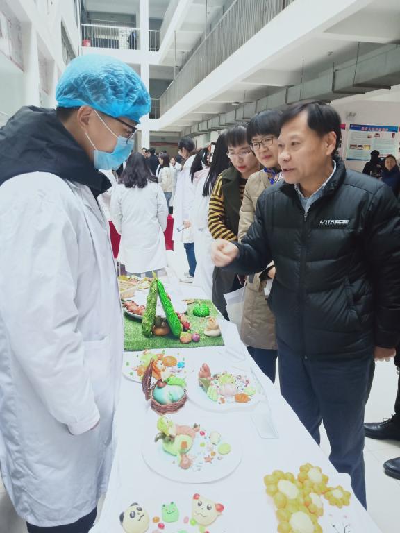 王变奇与在场师生共同参观和品鉴了食品学院2017级毕业生的三十余种产品及水果拼盘创意作品,并和学生进行亲切交谈。他对美食节活动的成功举办给予了充分肯定。
