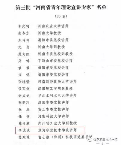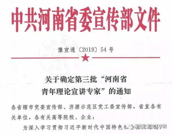 日前,中共河南省委宣传部下发《关于确定第三批“河南省青年理论宣讲专家”的通知》(豫宣通〔2019〕54号),公布了评选确定的第三批“河南省青年理论宣讲专家”30名,我校思政部李诚诚老师榜上有名,是全省唯一一名高等职业院校教师。