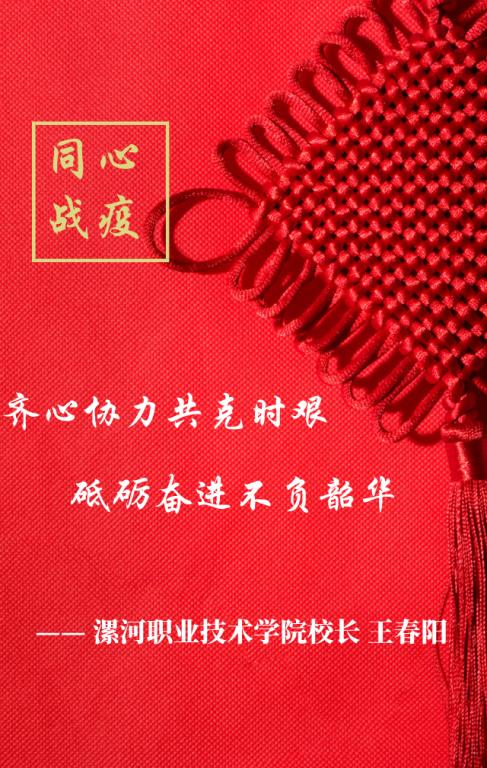 同学们,虽然我们未能如期相聚校园,但我感觉我们从未分开, 学校的老师们也时时刻刻在关心关注着你们。在这疫情防控的特殊时期,延期开学不是不上课,学校一向注重教书育人,多次召开专题会议提早布局2020年春季开学及线上教学安排,已经利用超星学习通、智慧职教、腾讯课堂、钉钉等平台开设264门线上课程,确保疫情防控期间教学任务不减、教学质量不降。我希望,同学们要切实增强大局意识和全局观念,严守“五个一律”要求,认真落实学校的各项疫情防控措施,能不出来就待在家里,不要去人多的地方,出门带好口罩,如实上报信息,在做好自己和家人安全防护的同时,确保学习不掉队,及时了解学校线上课程安排,提前做好线上课程学习准备,准时参加线上授课与辅导答疑,养成自主学习、主动学习的习惯,真正做到停课不停学,以健康的体魄和饱满的精神状态迎接新学期的到来。我相信,你们都是国家未来的“守护者”,你们和奔赴前线的医生们一样,都是国家的希望,你们一定可以担负起使命和责任,在国家危难、民族有难的情况下,为坚决遏制疫情扩散、夺取防控斗争胜利贡献青春力量!