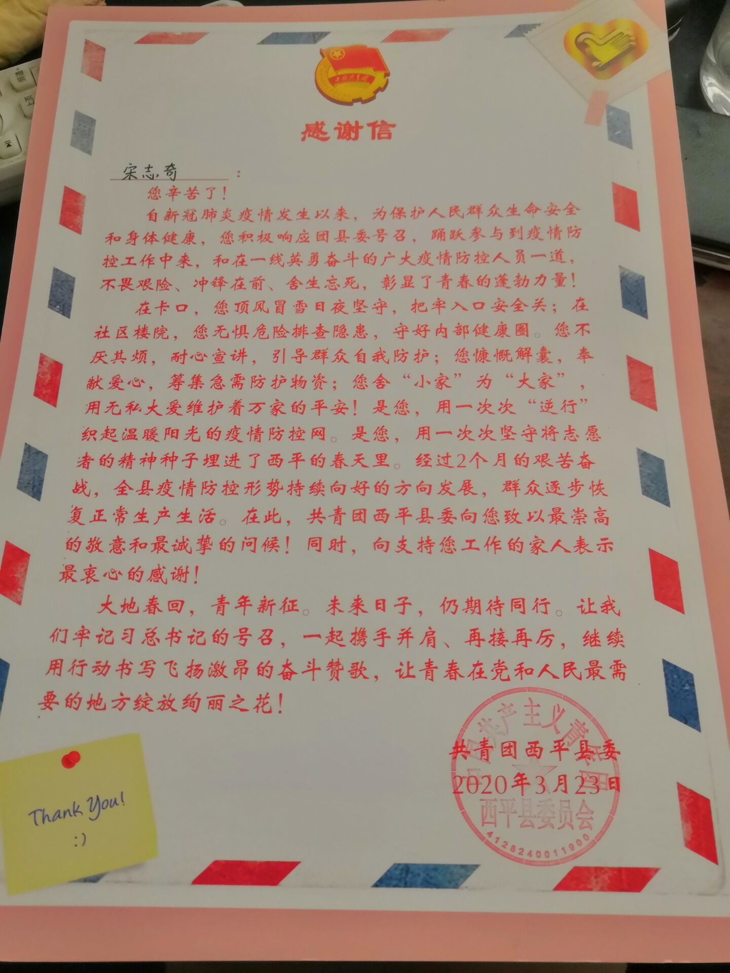 在全国上下众志成城抗击新冠肺炎疫情期间,我校广大青年学子勇挑重担,积极响应校党委号召,主动投身到社区、乡村的防控工作中。近日,我校收到共青团西平县委、西平县专探乡汪寨村民委员会寄来的感谢信,对建筑工程学院18级建筑装饰班宋志奇同学投身疫情防控志愿服务工作给予了充分肯定,对我校育人工作的成效表示感谢。