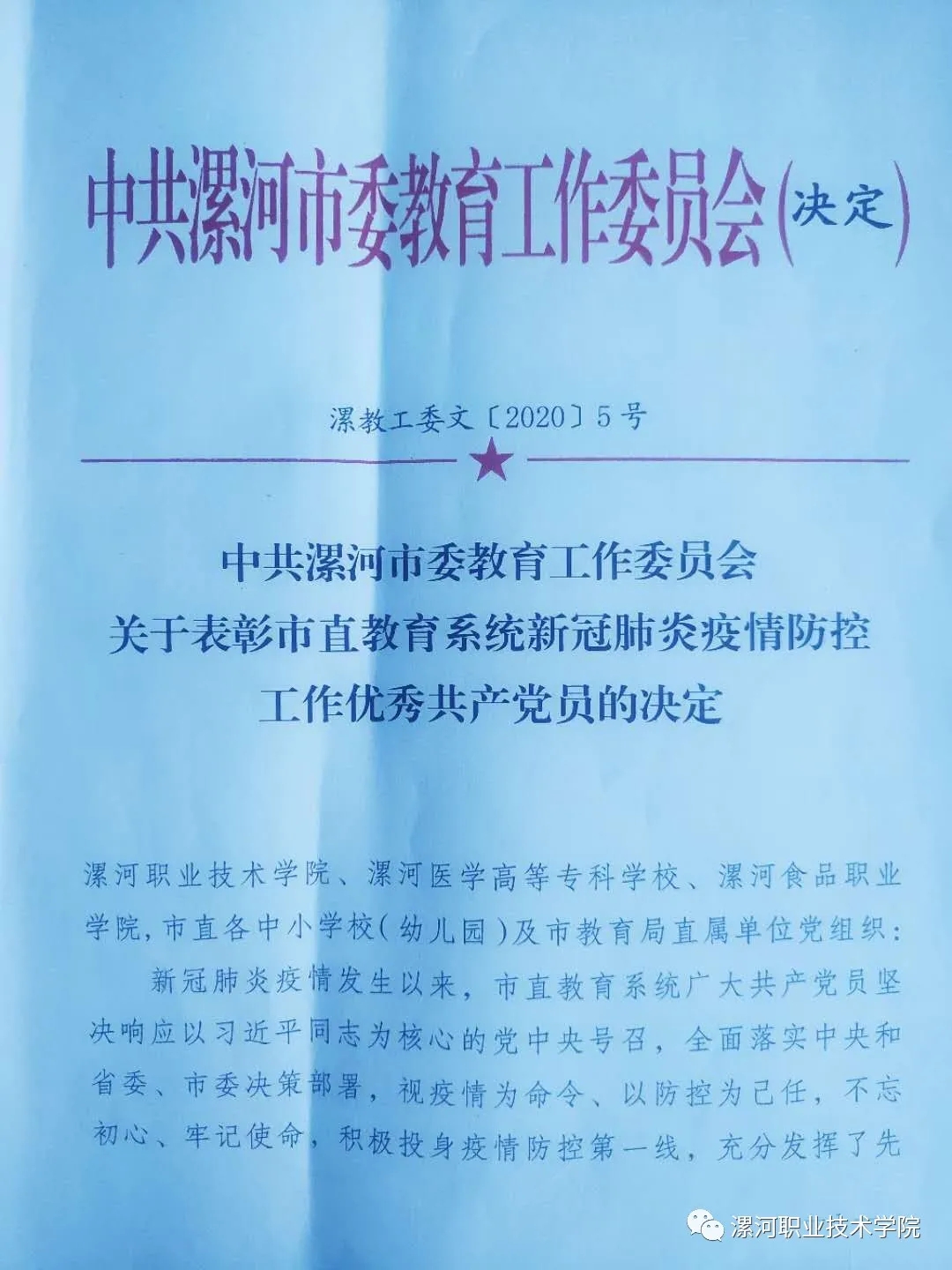 近日,中共漯河市委教育工作委员会下发了《关于表彰市直教育系统新冠肺炎疫情防控工作优秀共产党员的决定》(漯教工委文〔2020〕5号)文件,我校王皓、王磊杰两位党员教师在新冠肺炎疫情防控工作中表现突出,被评为“优秀共产党员”。