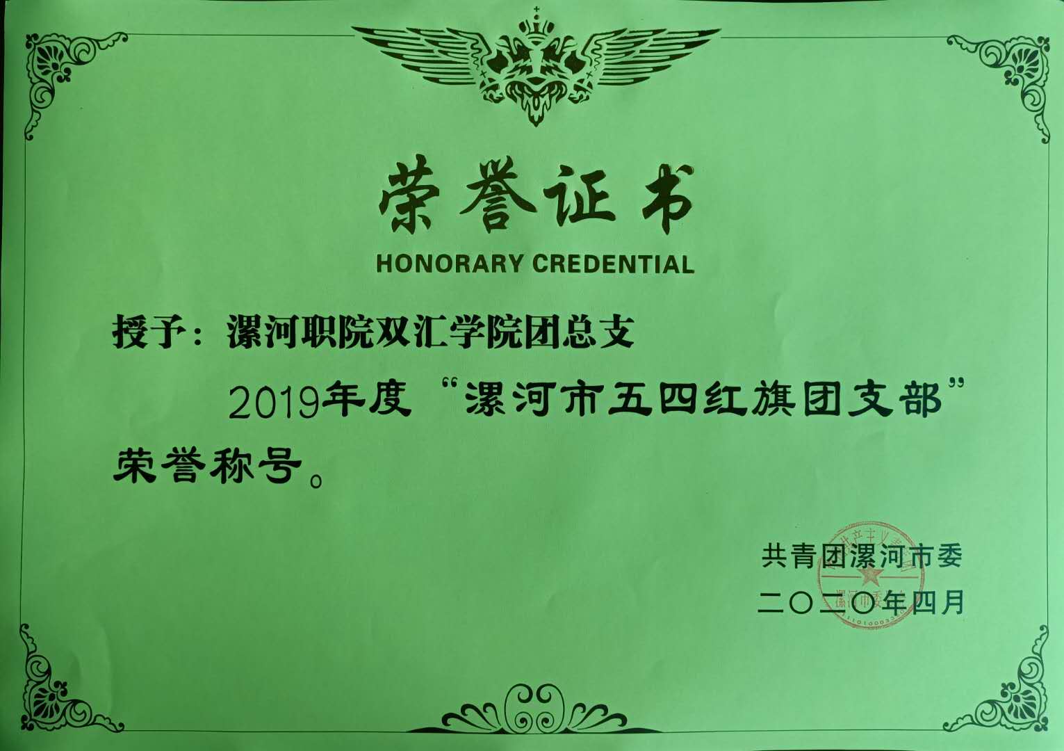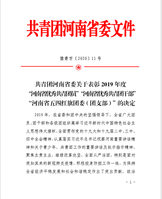 近日,从共青团河南省委、共青团漯河市委传来喜讯,yl7703永利官网在2019年度共青团工作中喜获多项荣誉,校团委被评为2019年度“河南省五四红旗团委”、2019年度漯河市“共青团工作先进集体”。“河南省五四红旗团委”是团省委授予河南共青团基层组织的最高荣誉,每五年为一个创建周期,此次获评“河南省五四红旗团委”,是我校在荣获2015年度“河南省五四红旗团委”称号基础上再获表彰,既是对我校共青团工作的肯定,也是对全校各级团组织和广大团员青年的鼓励。值此五四青年节到来之际,我们谨以青春的名义向大力支持学校共青团工作的领导和师生致以崇高的敬意!