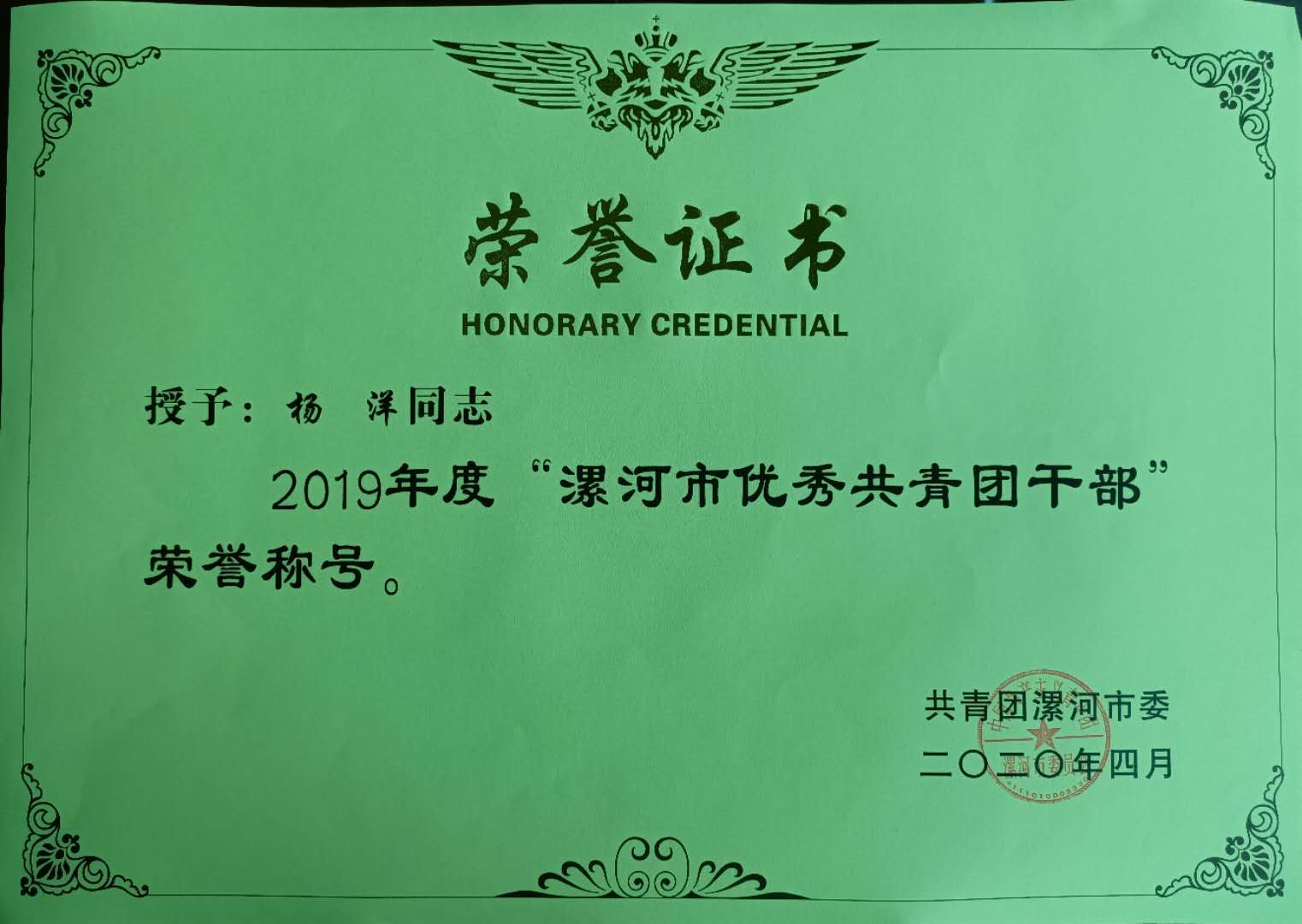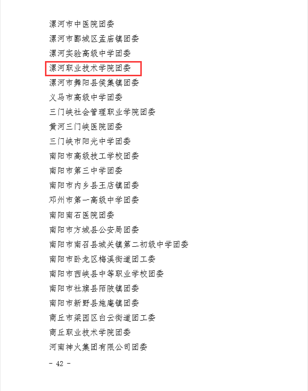 在漯河市“两红两优”评选中,学校双汇学院团总支、许慎文化学院团总支荣获2019年度“漯河市五四红旗团支部”,电气电子工程系团总支书记杨洋老师、双汇学院团总支书记刘智老师荣获2019年度“漯河市优秀共青团干部”,机电工程系18级机电一体化二班张鹏同学、双汇学院18级市场营销一班高中耀同学荣获2019年度“漯河市优秀共青团员”称号。