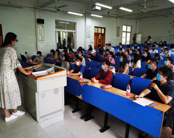 特殊时期,全体参与人员均佩戴口罩,保持一米以上距离。整个答辩过程分两个阶段。第一阶段先进行示范答辩,答辩同学边播放ppt边陈述自己的论文,陈述完毕答辩组教师针对论文内容提出问题,答辩学生经过十分钟左右准备时间后,依次回答答辩组老师的问题,最后是答辩组老师点评,全部过程紧张有序精彩纷呈。第二个阶段分小组答辩,每个小组在组长的精心组织下,按照公开答辩过程,认真组织学生进行答辩。