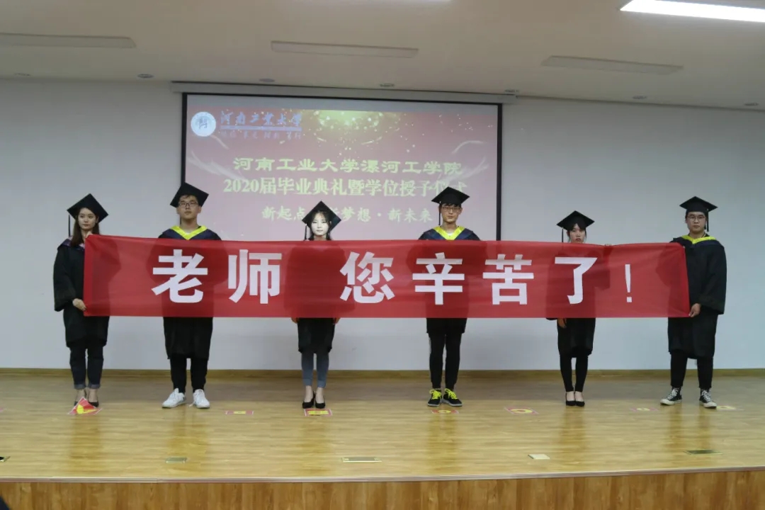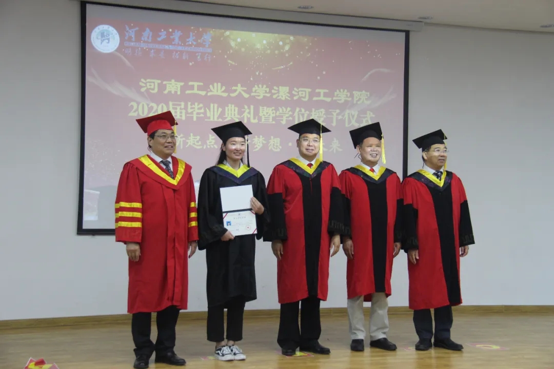 河南工业大学漯河工学院副校长朱晓红宣读《河南工业大学漯河工学院关于对2020届毕业生先进个人表彰的决定》,副校长王变奇宣读《河南工业大学漯河工学院关于授予2020届毕业生学士学位的决定》,副校长代骅为2020届省级优秀毕业生、国家奖学金获得者、国家励志奖学金获得者颁奖,工会主席吕爱华为免推研究生、已录取研究生颁奖。