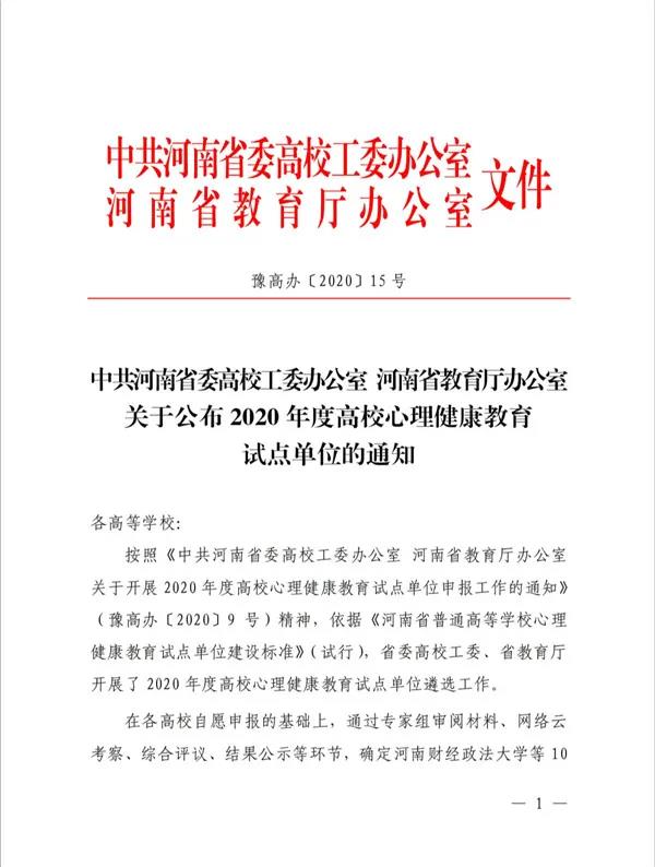日前,由河南省委高校工委、省教育厅组织开展的河南省心理健康教育试点单位创建评估结果揭晓,经过材料评审、网络云考察、综合评议、结果公示等评审环节,我校成功入选2020年度高校心理健康教育试点单位。此次评选中,我校心理健康教育中心以创新的理念、完善的机制、扎实的工作获得了省专家组的认可。