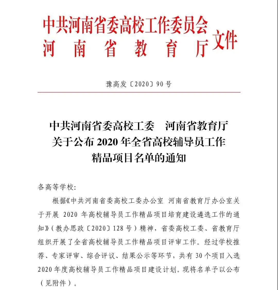 日前,中共河南省委高校工委、河南省教育厅下发《关于公布2020年全省高校辅导员工作精品项目名单的通知》(豫高发〔2020〕90号),我校《“梦想•起航”国防教育育人模式》成功入选2020年全省高校辅导员工作精品项目建设计划,实现了我校在此项目评选中的新突破,为我校学生管理工作再添新荣誉。