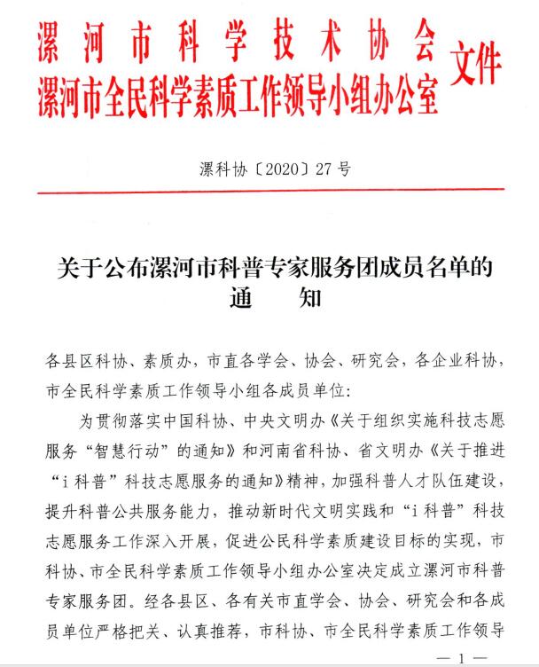 近日,漯河市科学技术协会、漯河市全民科学素质工作领导小组办公室印发《关于公布漯河市科普专家服务团成员名单的通知》(漯科协〔2020〕27号),我校赵建功、崔惠玲、李绍鹏、贾娟、张超凡、赵艳平、高倩、芦荣华等8位教师成功入选。