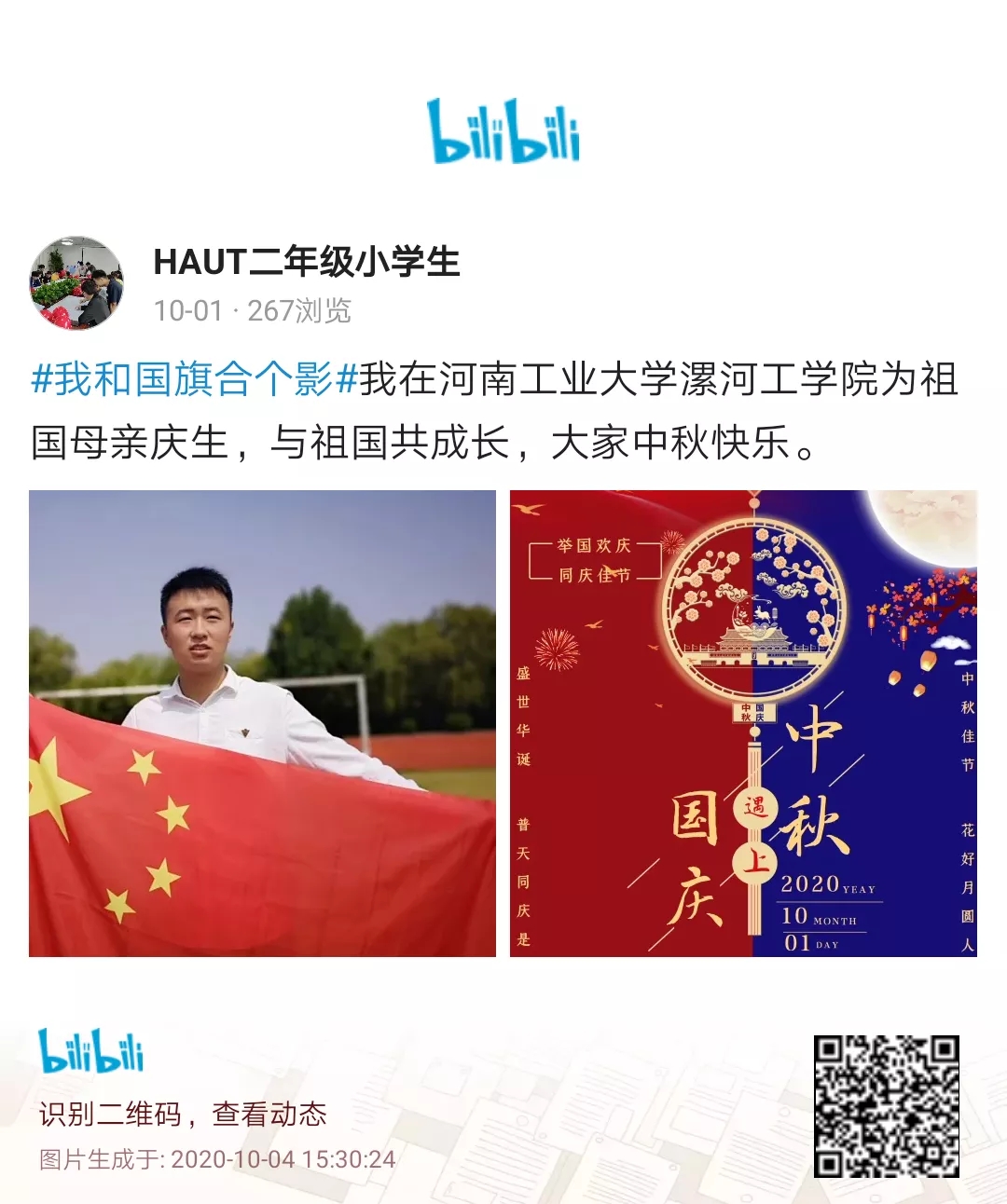 10月1日,共青团中央在B站发起#我和国旗合个影#表白祖国活动中,河南工业大学漯河工学院姚树豪同学的动态被共青团中央点赞。
