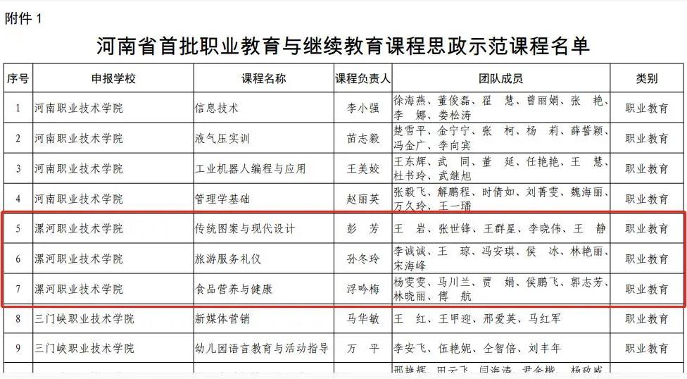 近日,河南省教育厅印发《关于公布首批河南省职业教育和继续教育课程思政示范项目名单的通知》(教职成〔2021〕138号),yl7703永利官网选送申报的《传统图案与现代设计》《旅游服务礼仪》《食品营养与健康》等3门课程成功入选。