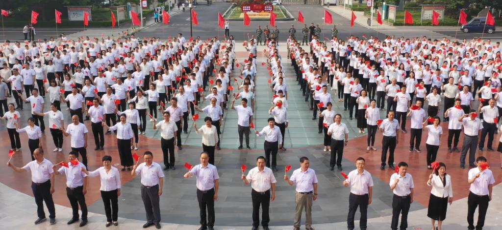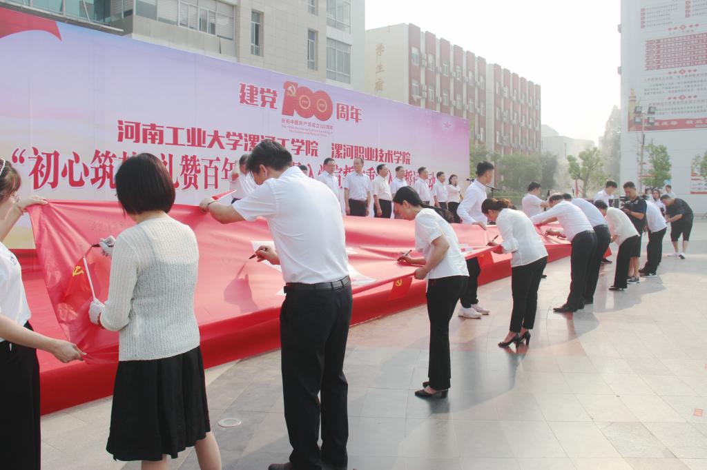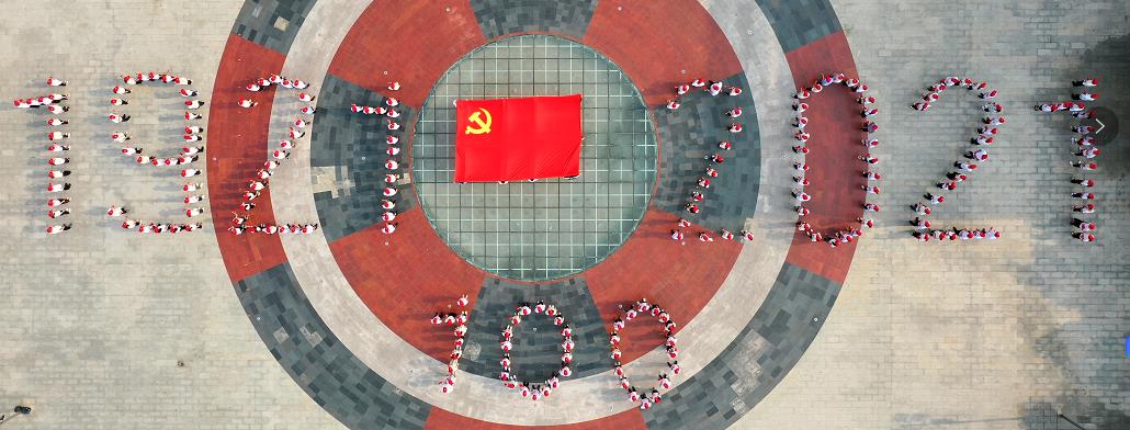 活动结束后,yl7703永利官网221名党员教职工在学校实训广场上组合成1921-2021、100等大字,用自己的方式向党的百年华诞献礼。