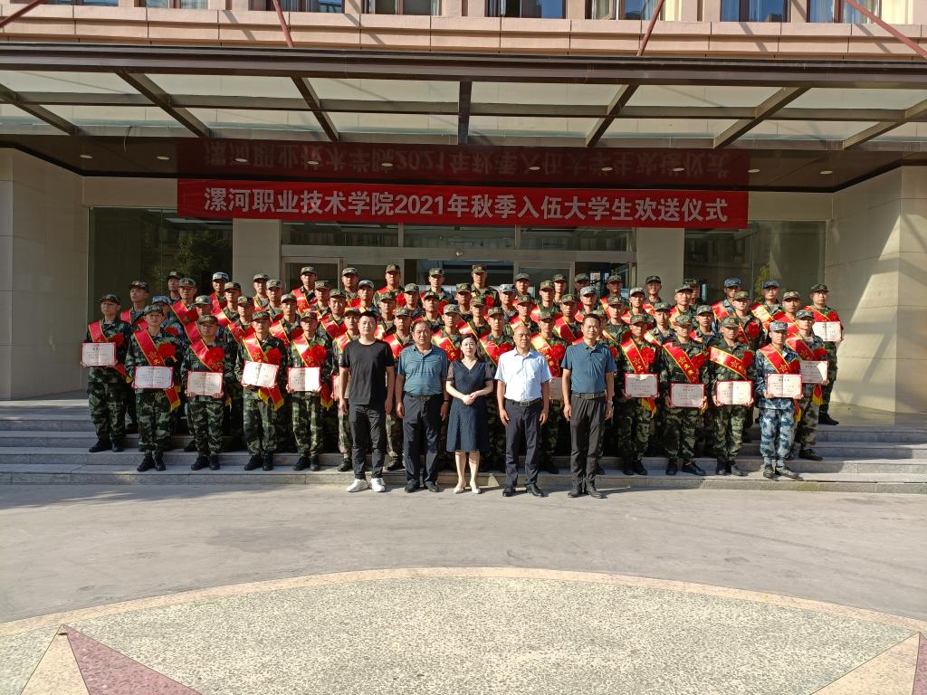9月22日下午,漯河职院举行了2021年秋季入伍大学生欢送仪式,为即将入伍的同学们送行。校党委委员、副校长程传蕊出席仪式。学校武装部有关同志、62名应征入伍大学生参加了欢送仪式。仪式由学校学工部部长王群星主持。