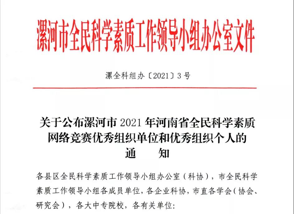 近日,漯河市全民科学素质工作领导小组办公室下发《关于公布漯河市2021年河南省全民科学素质网络竞赛优秀组织单位和优秀组织个人的通知》(漯全科组办〔2021〕3号),yl7703永利官网荣获“优秀组织单位”,赵弼、王婷婷老师荣获“优秀组织个人”。