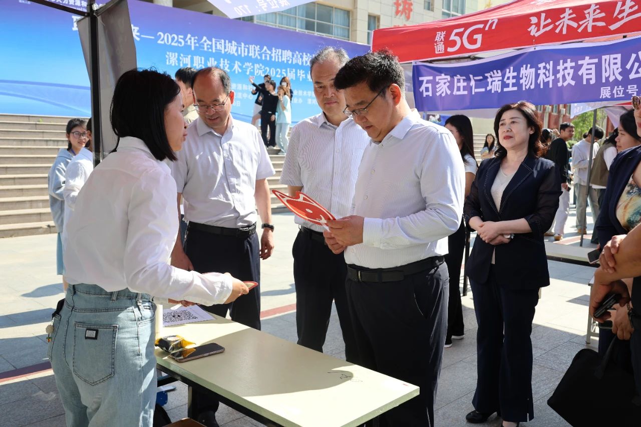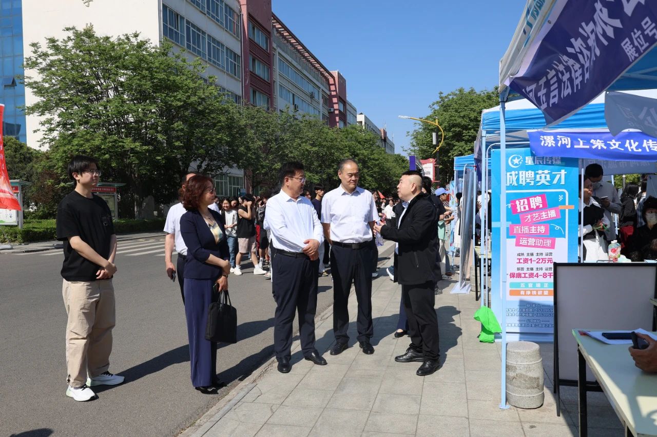 yl7703永利官网院长薛存心,漯河市人力资源和社会保障局局长曹江涛,四级调研员娄红蕾,yl7703永利官网副院长程传蕊亲临现场,与毕业生及用人单位招聘负责人亲切交流。