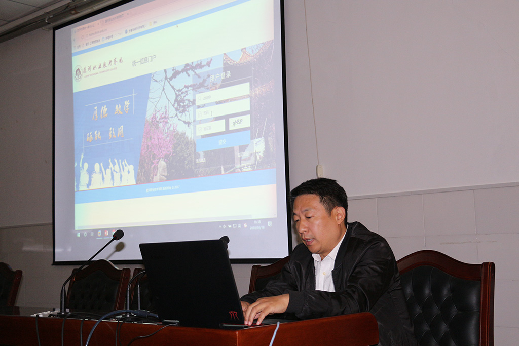 10月18日,现代教育技术中心开展信息化培训,现代教育中心主任王磊杰、赛尔网络工程师靳军强讲授了统一信息门户应用及正版软件安装使用等内容,各部门信息化管理员和学生会信息部成员参加培训。