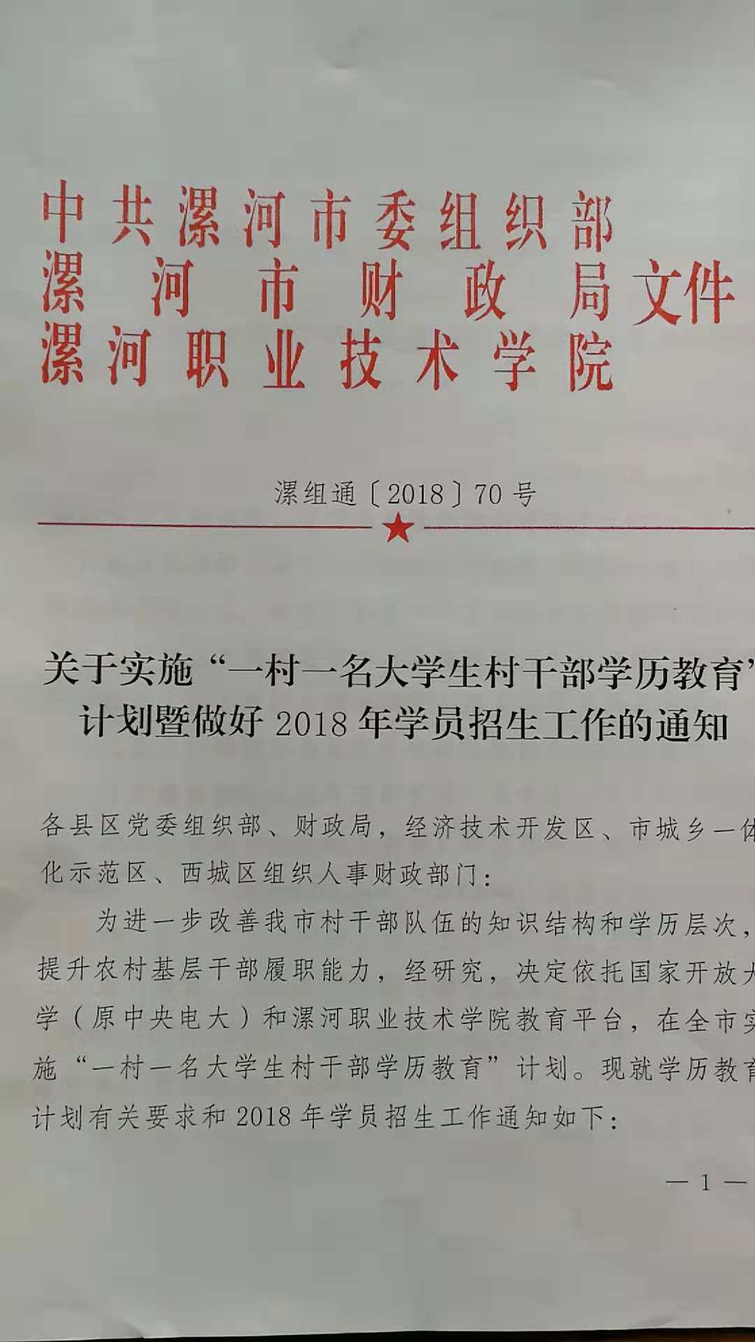 为进一步改善漯河市村干部队伍的知识结构和学历层次,提升农村基层干部履职能力,漯河市委组织部、漯河市财政局、yl7703永利官网联合发文,决定依托国家开放大学(原中央电大)和yl7703永利官网教育平台,在全市实施“一村一名大学生村干部学历教育”计划,自2018年开始,用3-4年时间,分批开展培养教育,到2021年我市每个行政村至少有一名大专以上学历的村干部。全市第一期大专学历教育开设行政管理(村镇管理方向)、农业经济管理专业,名额约400名。漯河市“一村一名大学生村干部学历教育”计划由yl7703永利官网成人教育部具体负责组织实施。除开展学历教育外,还增设了专业拓展培训,每学期集中培训5天,共计培训20天。
