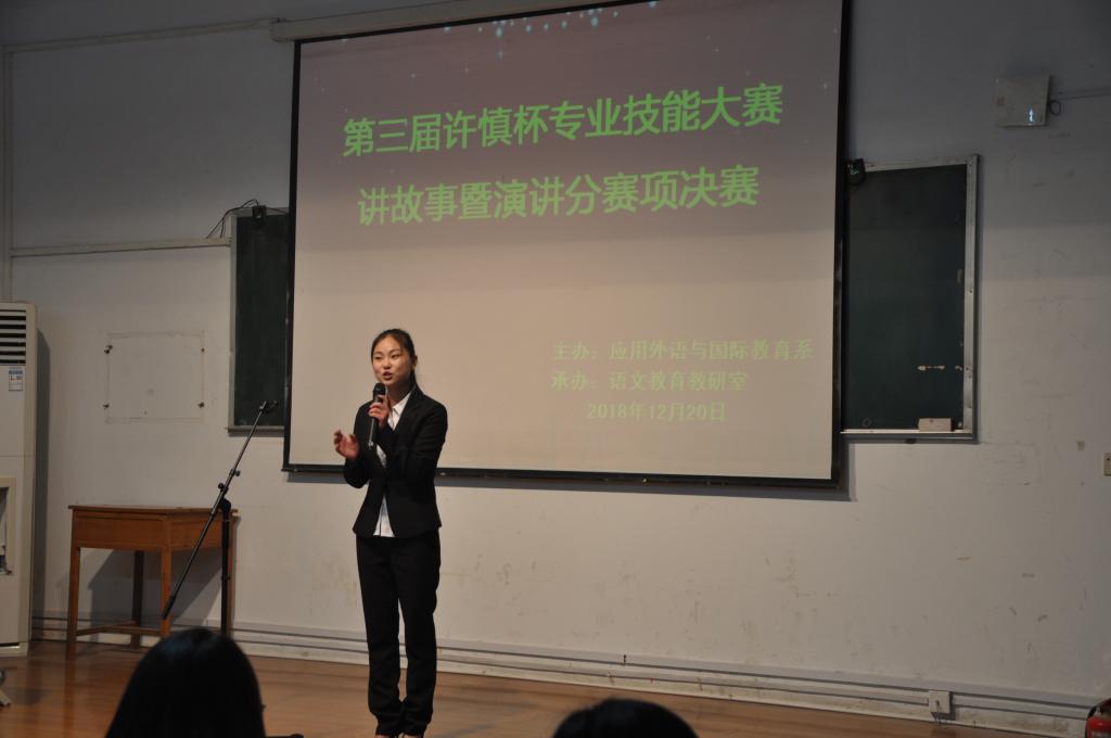 12月20日晚,应用外语与国际教育系第三届“许慎杯”专业技能大赛·讲故事暨演讲比赛分赛项决赛举行。副主任孟令超,各教研室主任,语文教育、小学教育教研室教师出席,语文教研室全体教师担任评委,2017、2018级的200多名学生代表观看比赛。