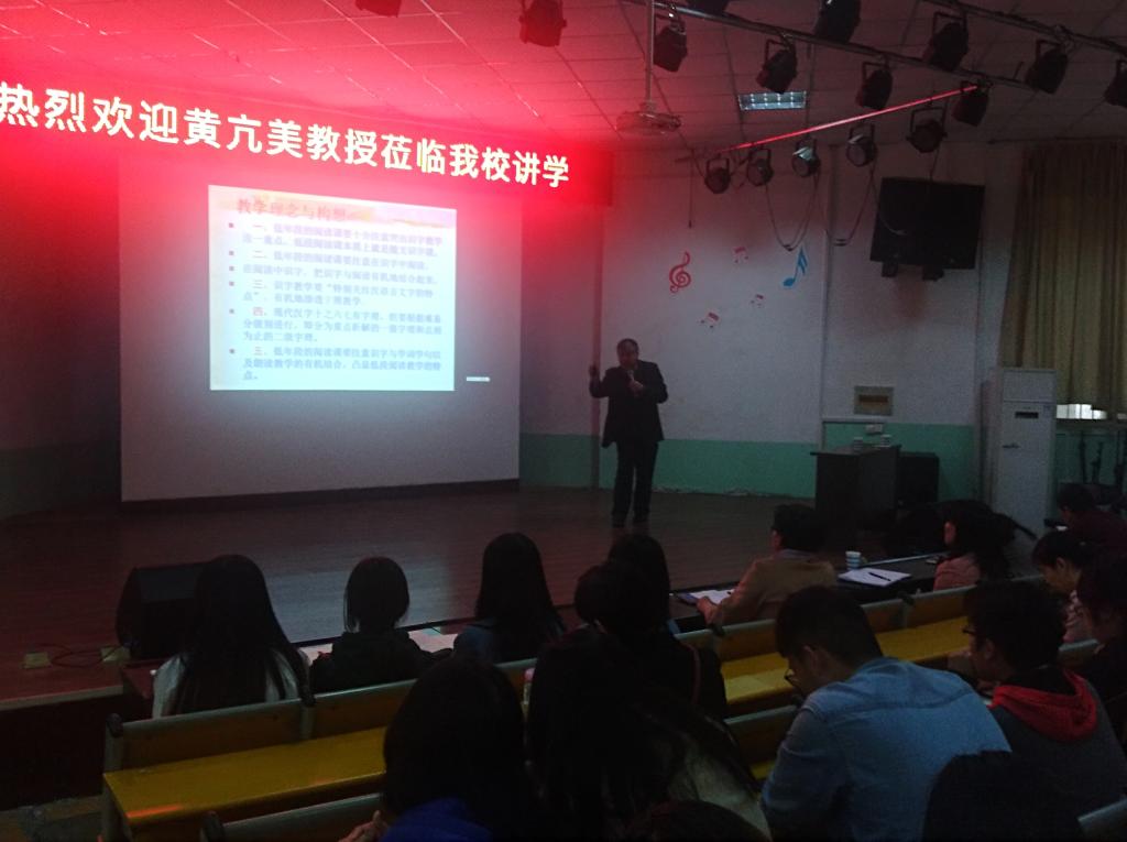 3月27日,广西师范学院研究员,硕士研究生导师,中国高等教育学会全国字理教学研究中心理事长,我校兼职教授黄亢美先生应邀做题为“低段阅读教学中的随文识字方略”为主题的学术讲座。许慎文化学院全体领导班子成员、语文教育教研室、小学教育教研室全体老师、2017、2018级语文教育专业辅导员和近300名学生共同聆听了此次讲座。讲座由许慎文化学院副院长孟令超主持。