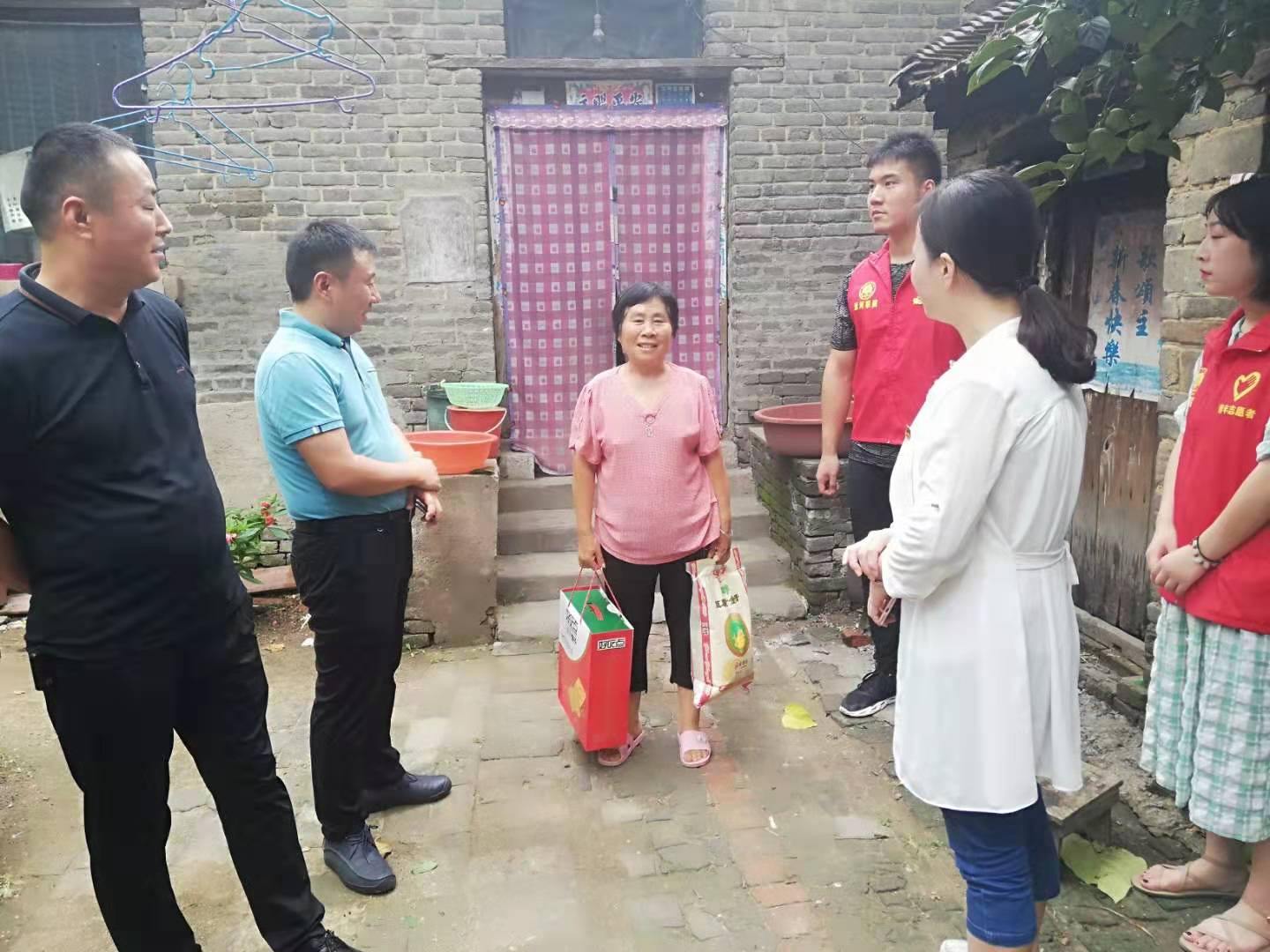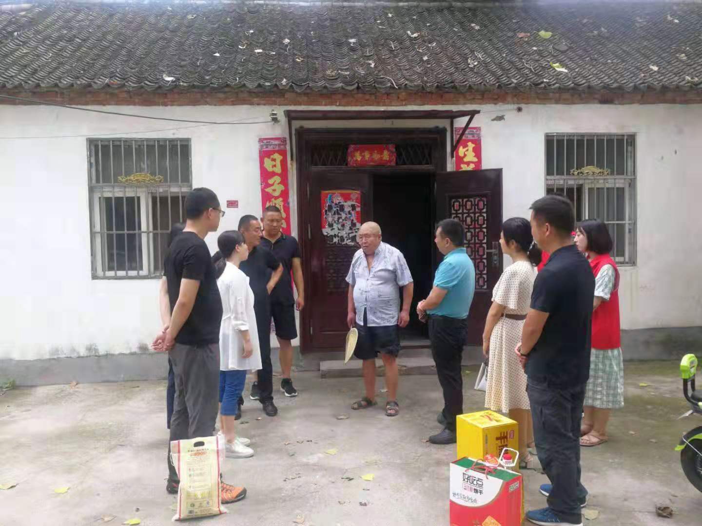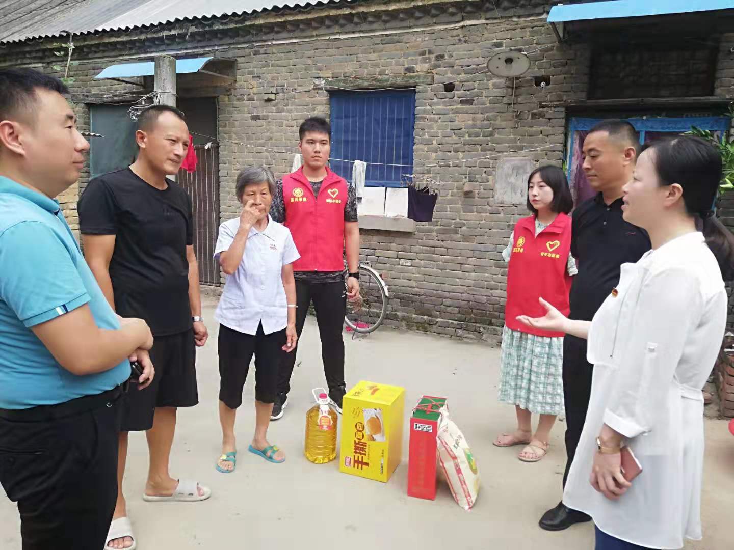 7月27,校团委书记周茜、团舞阳县委书记李静带领校助力“第一团支书”专项社会实践服务队全体成员和省派驻村第一团支书、漯河市天衡机械有限公司总经理王华锋、孟寨镇人大主席康岸毅一行深入村内留守儿童、空巢老人、大病致贫等家庭,对这些家庭进行了解,并亲切交谈。