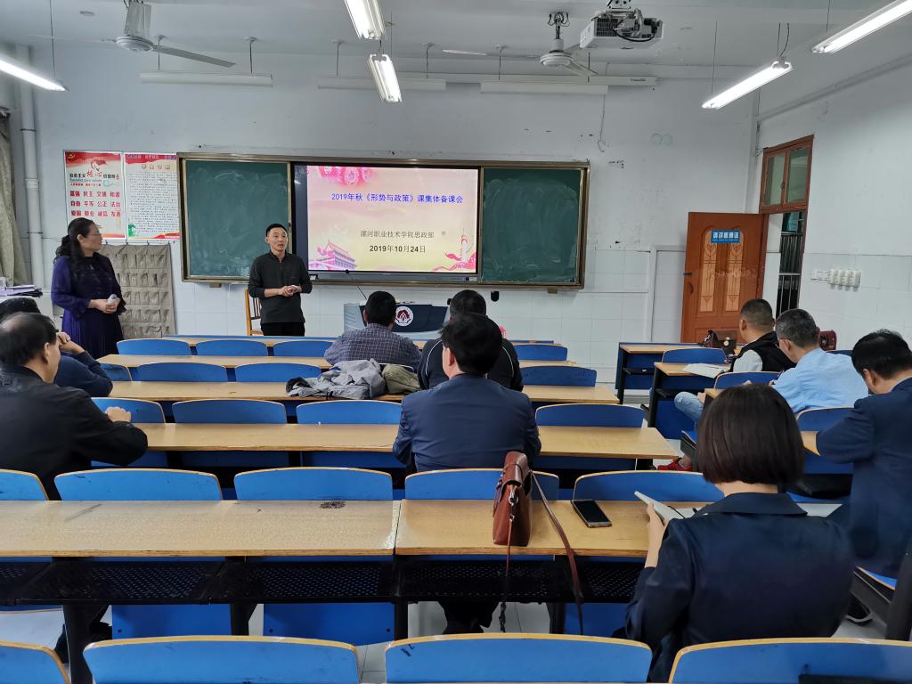 为贯彻落实习近平总书记在学校思想政治理论课教师座谈会上的重要讲话精神,提升思政课教学质量和水平,按照教育部办公厅关于印发《高校“形势与政策”课教学要点(2019年下辑)》的通知精神和我校工作实际,10月24日,思政部召开了2019年秋季《形势与政策》课集体备课会。思政部相关负责人、学校各院系的主要领导、思政课全体专兼职教师参会。