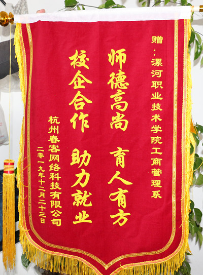 2020年1月6日,杭州春客网络集团王猛经理一行专程赶赴我校工商管理系赠送了一面写有“师德高尚 育人有方,校企合作助力就业”的锦旗,以表彰我校工商管理系师生在2019年度工商管理系与杭州春客网络集团合作的“双十一”安踏项目运营中的出色表现。