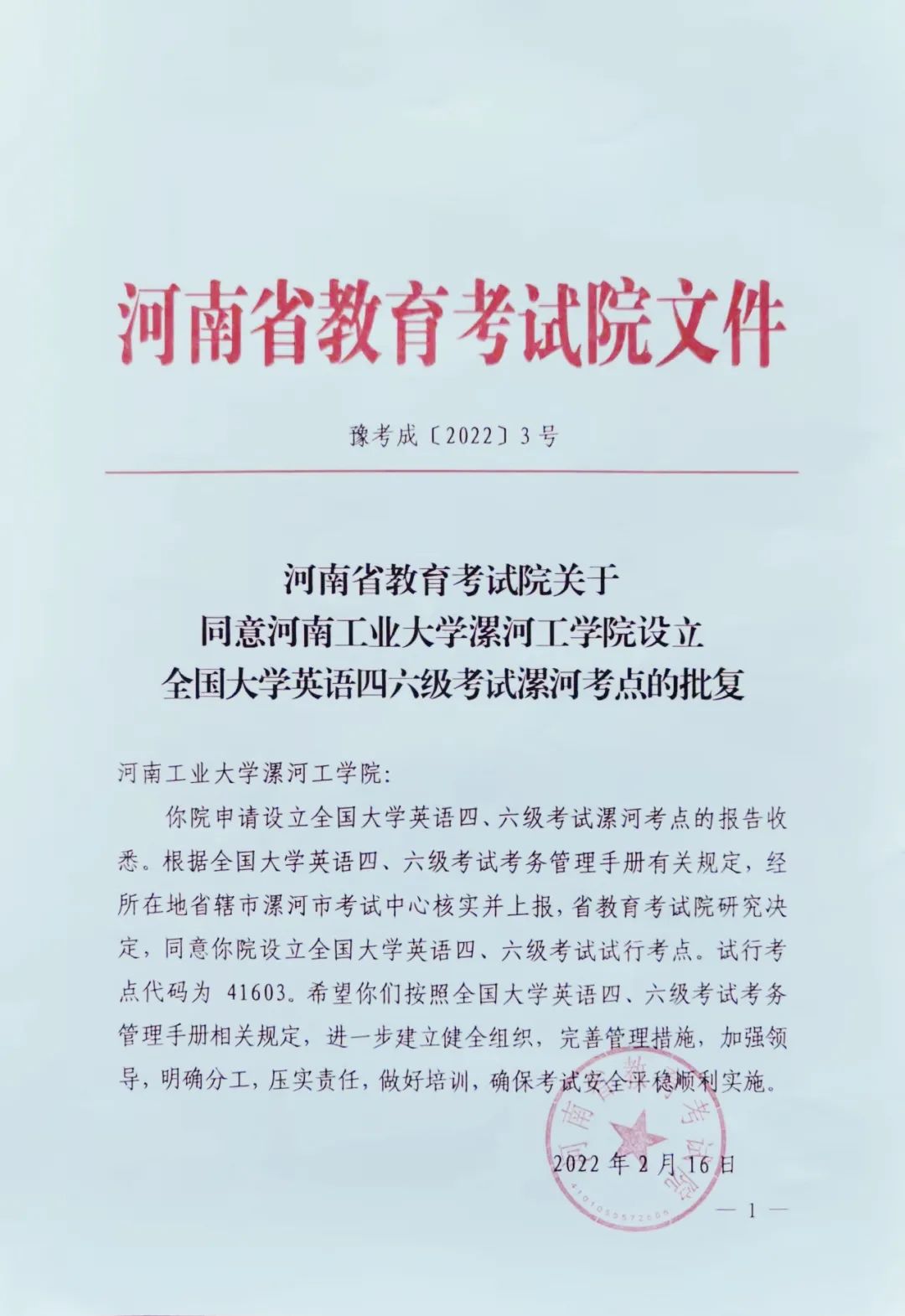 近日,我校收到河南省教育考试院《关于同意河南工业大学漯河工学院设立全国大学英语四六级考试漯河考点的批复》,漯河工学院英语四六级独立考点申报工作取得成功。2022年6月起,漯河工学院将作为独立考点组织英语四六级考试。