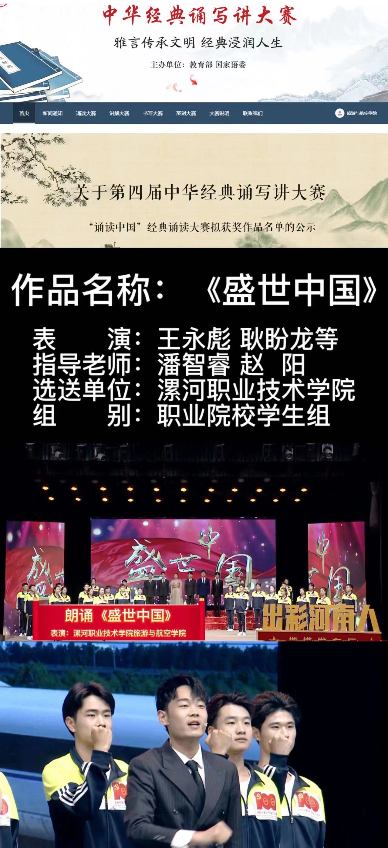 第四届中华经典诵写讲大赛历经地区初赛、全国复赛和全国总决赛,于近期落下帷幕。由我校旅游与航空学院教师潘智睿、赵阳指导的作品《盛世中国》荣获全国优秀奖。