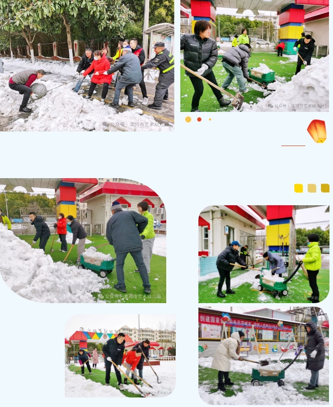 除雪现场,老师们不畏严寒,拿起铁锹、扫帚、小车等劳动工具,扫积雪、除冰层。大家齐心协力,用速度和温度续写最快的奔赴和最温暖的守护,为保障孩子们的入园安全,大家全力以赴!