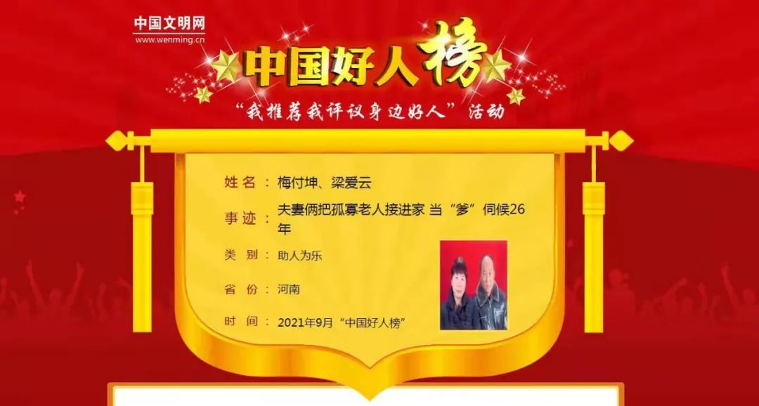 梅付坤,男,1957年1月出生,64岁;梁爱云,女,1961年4月出生,60岁,夫妻两人是河南省漯河市舞阳县孟寨镇梅庄村村民。他们照顾孤寡老人26载,受到了乡亲们的一致赞扬,他们的事迹也被各家媒体报道,夫妻两人也先后被评选为“十佳市民”“漯河好人”,其家庭被评选为“五好家庭”“平安和谐家庭”。