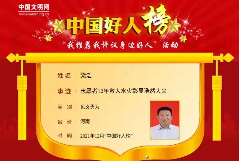 梁浩,男,1973年7月生,河南省漯河市星火志愿团队志愿者。在河南省遭遇洪水灾害时,他与灾区人民心连心共患难,义无反顾地带领救援志愿者深入灾区,挽救了80多条生命和数十万元的群众财产。同时,他还是一位古道热肠的好心人,从事公益活动12年,带领志愿团队慰问革命老兵及军烈属、关爱社会弱势群体、救助危难群众、开展水上救援等累计500余次,足迹遍布漯河市各个角落。2021年,他被评为河南省防汛救灾“身边好人”。