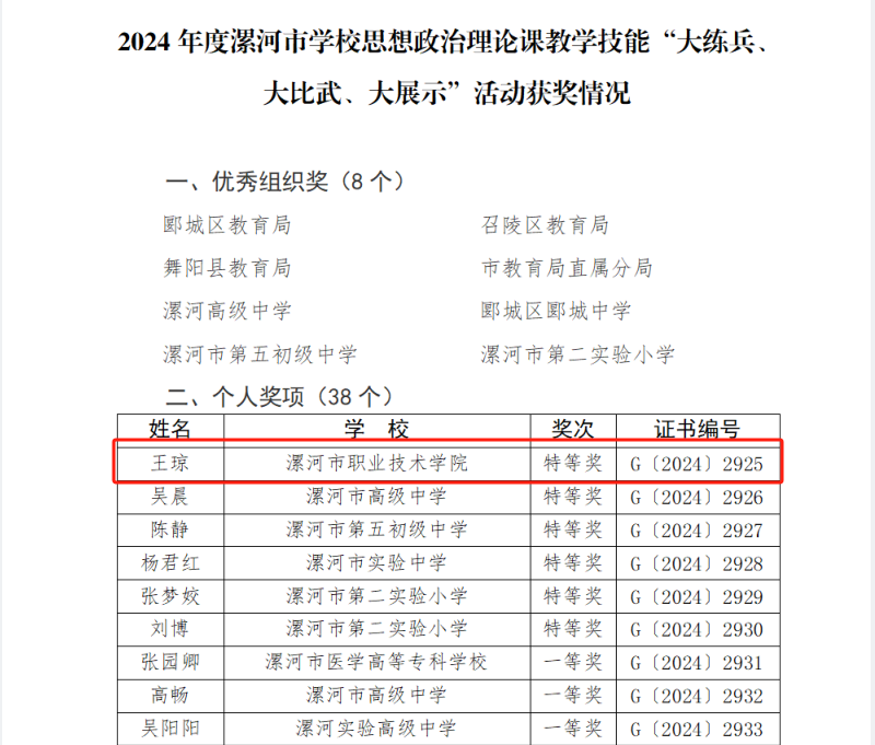 近日,中共漯河市委教育工作委员会、漯河市教育局下发《关于公布2024年度全市学校思想政治理论课教学技能"大练兵、大比武、大展示"活动获奖情况的通知》(漯教工委文〔2024〕22号),yl7703永利官网马克思主义学院思想政治理论课教师王琼、李果分别荣获特等奖和二等奖。