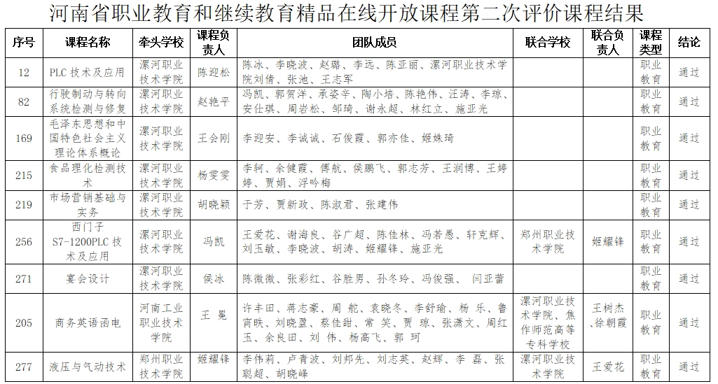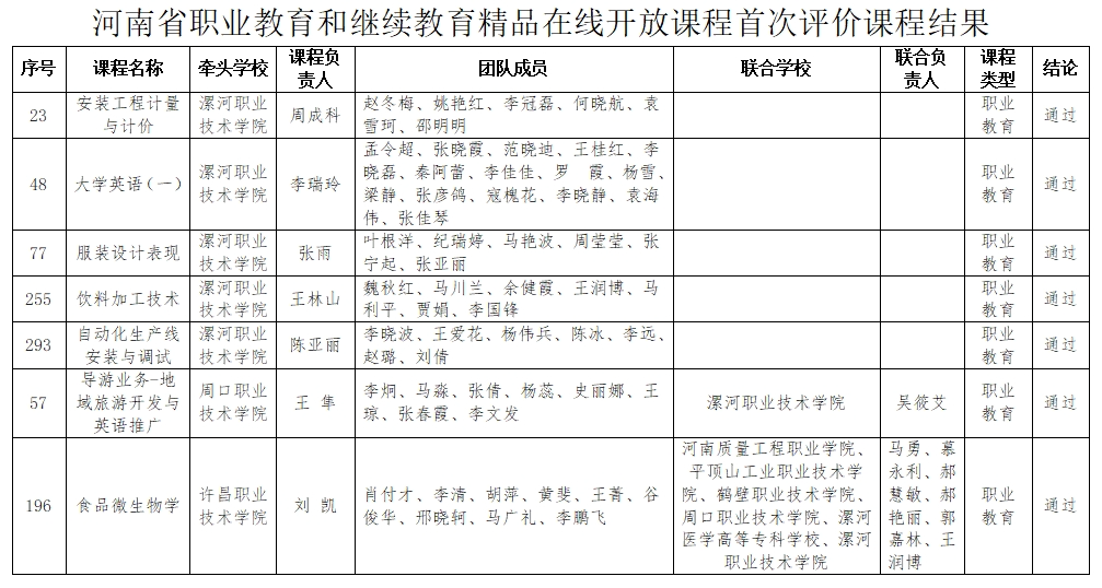近日,按照《河南省教育厅办公室关于开展河南省职业教育和继续教育精品在线开放课程评价工作的通知》(教办职成[2024)264号)安排,经学院自评、专家评审等环节,yl7703永利官网2021年牵头立项建设《市场营销》等7门课程和参与立项建设《液压与气动技术》等2门课程全部通过第二次验收,2022年牵头立项建设《饮料加工技术》等5门课程和参与立项建设《导游业务-地域旅游开发与英语推广》等2门课程全部通过首次验收。