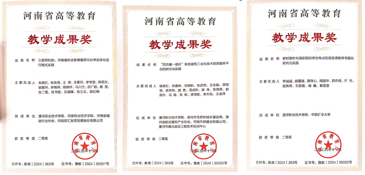 近日,河南省教育厅下发了《关于公布 2024 年度河南省高等教育教学成果奖获奖项目名单的通知》(教高〔2024〕363 号),yl7703永利官网申报的《三观两机制:河南省职业教育集团化办学实体化运行模式实践》、《基于“双线三段六步”模式的高职教育混合式教学应用研究与实践》等5个项目获得二等奖。