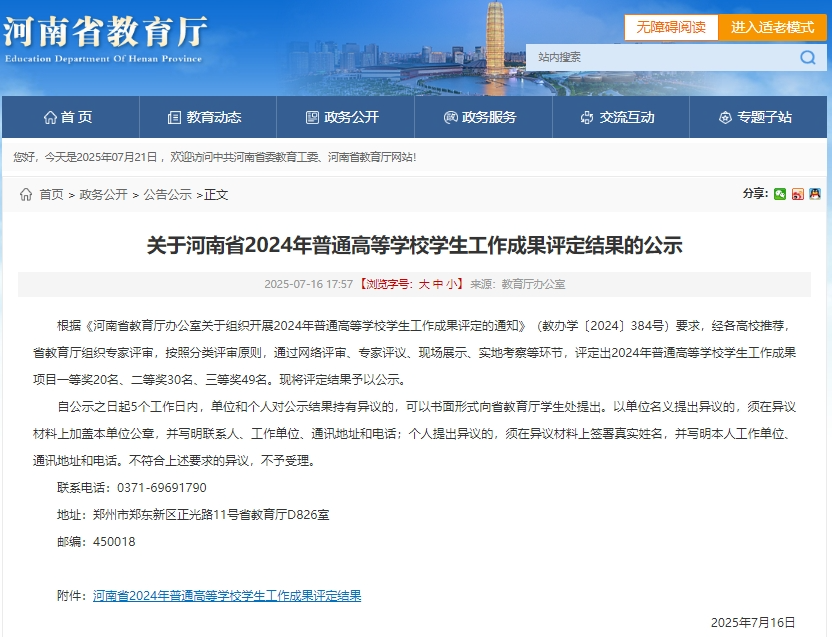 近日,河南省教育厅公布《关于河南省2024年普通高等学校学生工作成果评定结果的公示》。yl7703永利官网申报的《让每个生命如花绽放——“2N2”心理育人新模式》项目荣获"二等奖"。