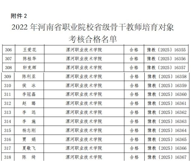 根据《河南省教育厅河南省人力资源和社会保障厅关于开展2022年河南省职业院校省级名师和省级骨干教师培育期满考核工作的通知》(教职成函〔2024〕418号)要求,yl7703永利官网高度重视并认真组织考核工作。经学校自主考核,以及省教育厅、省人力资源社会保障厅专家综合评审和结果公示,共有4名教师获评省级名师、13名教师获评省级骨干教师。
