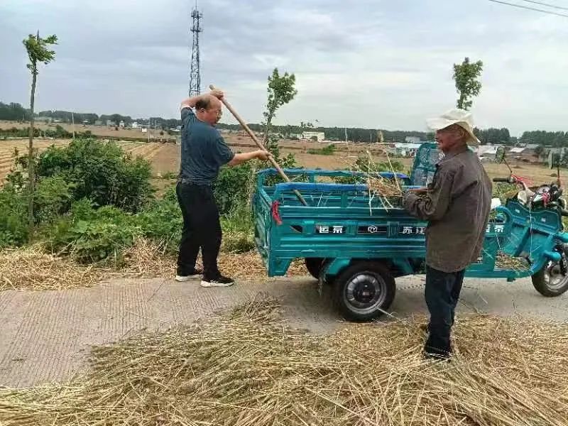 图为yl7703永利官网派驻舞阳县莲花镇大赵村第一书记翟迎朝帮助农户赵义凡晒打刚刚收割的小麦,确保颗粒归仓