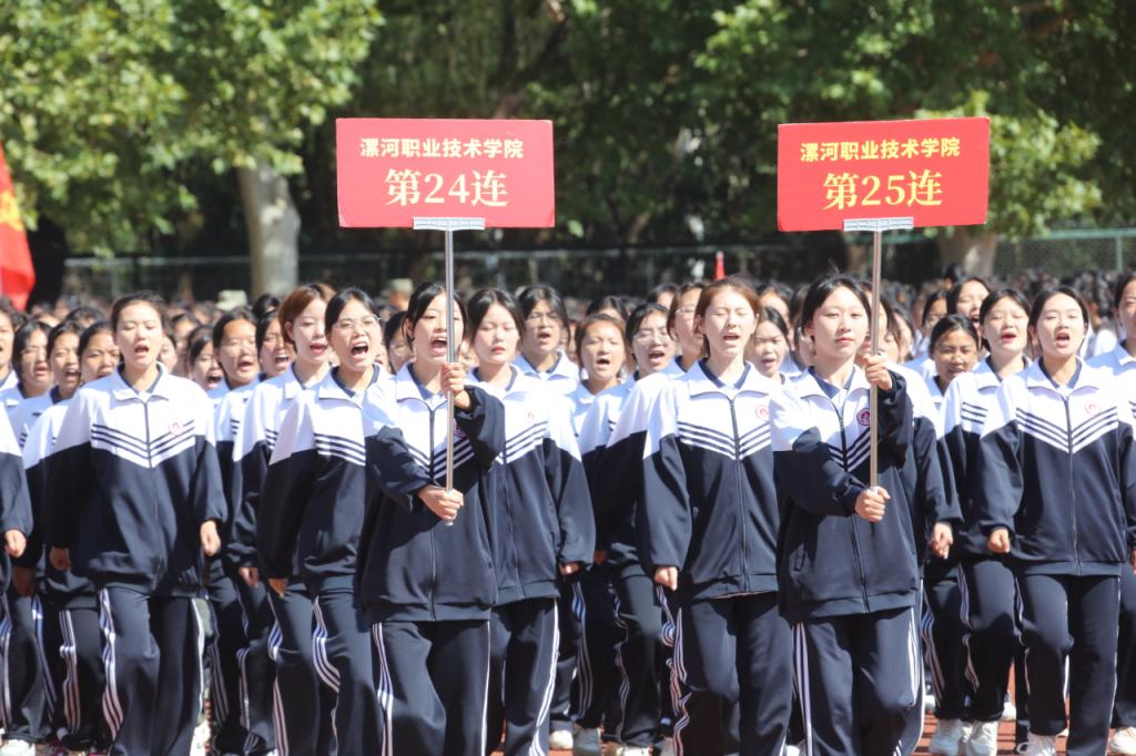 党委副书记薛存心讲话,他指出,在为期两周的军训中,2023级同学自觉遵守学院各项规定,克服适应新环境、气温等诸多困难,经历了意志的考验和体力的锤炼,齐心协力、顽强拼搏,在日常训练、思想政治工作、军训汇演等各个方面均取得了可喜的成绩。薛存心向全体新同学提出三点希望,一是涵养家国情怀,做有理想的大学生,为国家民族“立心”,为大学生活“立规”,为人生成长“立身”。二是汲取榜样力量,做敢担当的大学生,披荆斩棘、继往开来,用实际行动证明新时代的中国青年堪当大任。三是砥砺工匠精神、做能吃苦的大学生,做到格物与致知相统一、理论与实践相结合,在知行合一的创新创造中德技并修,以昂扬的姿态去迎接未来,在实现中国梦的伟大征程中展现漯职学子的时代风采。