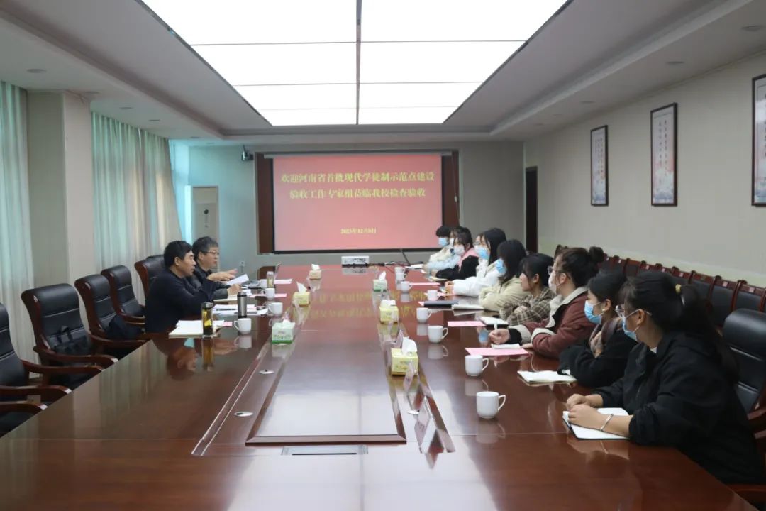 近日,由许昌职业技术学院副校长杨富营、黄河水利职业技术学院继续教育学院院长薛建荣、河南经贸职业职业学院产教融合推广中心主任胡创业、许昌职业技术学院教务处科长马广礼组成的专家组莅临yl7703永利官网,对现代学徒制示范点建设完成情况进行全面考察验收。党委委员、副院长朱晓红、程传蕊出席会议。教务处、学生处、招生就业处、河南省轻工纺织骨干职业教育集团、食品工程系相关负责同志及教师学生代表参加会议。