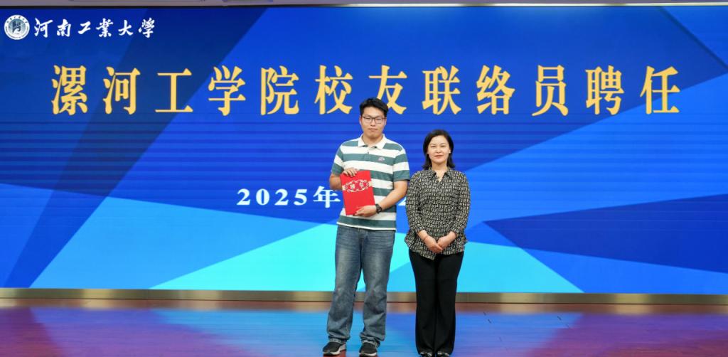 近日,河南工业大学举办2025届毕业生校友联络员聘任仪式暨培训大会。漯河工学院院长赵冬梅赴河南工业大学参会,并为校友联络员代表、市场营销专业学生乔昶颁发聘书。