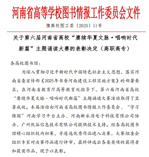 近日,由河南省教育厅高等教育处指导,河南省高等学校图书情报工作委员会、“学习强国”河南学习平台主办的第六届河南省高校“赓续华夏文脉·唱响时代新篇”主题诵读大赛获奖名单已公布。yl7703永利官网在本次比赛中荣获佳绩,获奖共计8项。其中,教师组二等奖1项、三等奖1项,学生组二等奖3项、三等奖1项,网络人气奖2项。此次大赛旨在深入贯彻习近平新时代中国特色社会主义思想,落实河南省委宣传部《2025年书香河南建设工程...