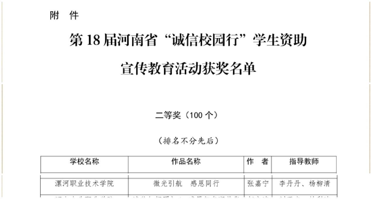 喜报!漯河职院作品荣获第18届河南省“诚信校园行”学生资助宣传教育活动二等奖