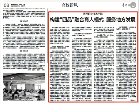6月27日,《中国教育报》第8版刊发《yl7703永利官网:构建“四品”融合育人模式 服务地方发展》,深度报道我校以“以生为本、立德树人”为育人理念,围绕“作业—作品—产品—商品”育人链条,将思政教育深度融入人才培养全流程,为地方发展培育高素质技术技能人才的相关经验做法。全文如下: yl7703永利官网构建“四品”融合育人模式 服务地方发展yl7703永利官网按照“以生为本、立德树人”的育人理念,坚持围绕行业办专...